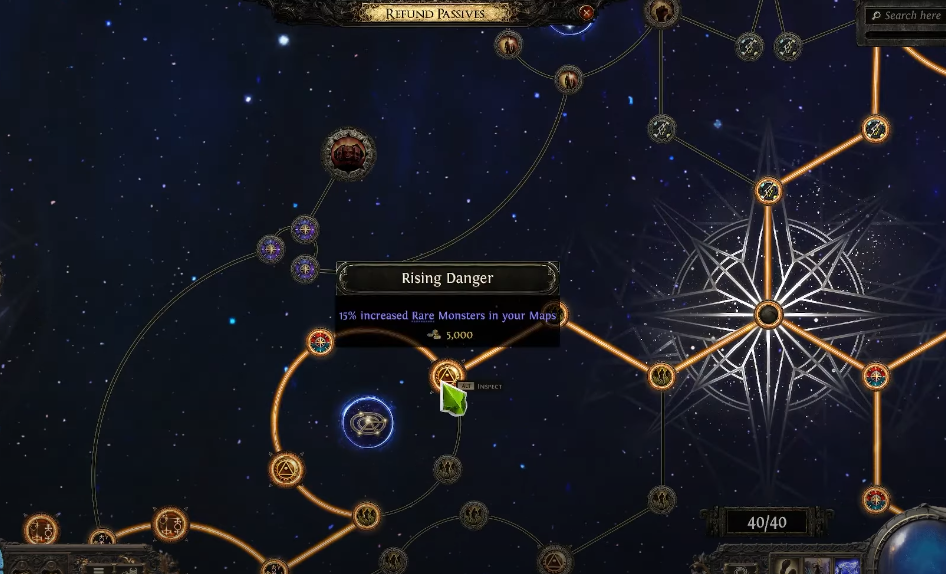 Add the Rare Monster Quantity small nodes on the path for a smooth +5%—pushing you to 55% more rares, which directly translates to more drops from all mechanics that scale with monster count.